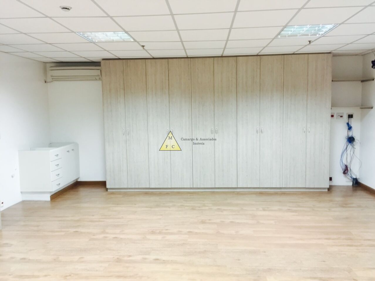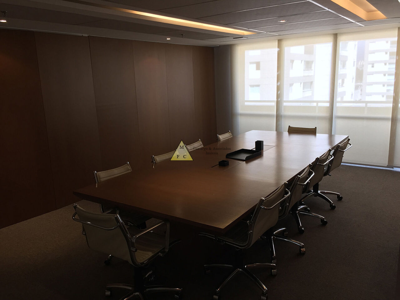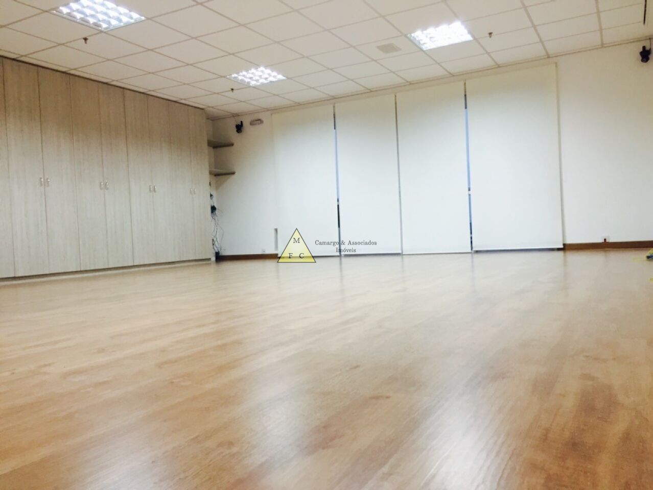 Forro de teto modular de fibra antichamas, piso laminado, sistema elétrico bem distribuído, muitas tomadas espalhadas pela sala, diversas luminárias e cortina rolo.