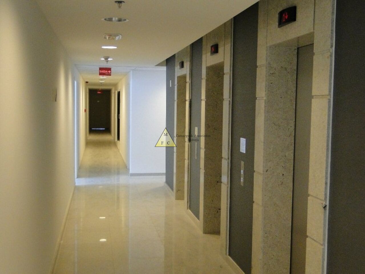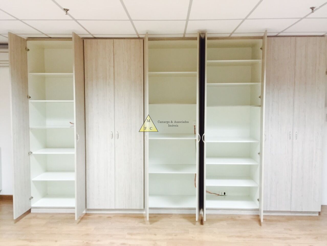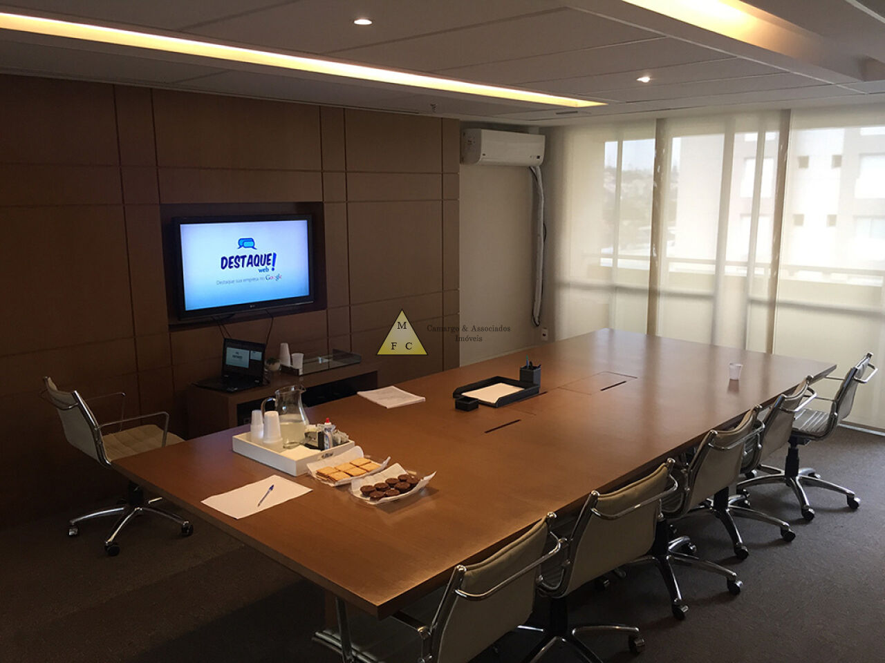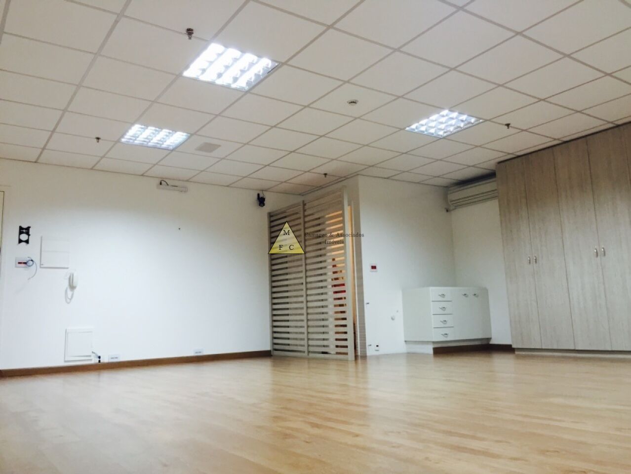 Forro de teto modular de fibra antichamas, piso laminado, sistema elétrico bem distribuído, muitas tomadas espalhadas pela sala, diversas luminárias e cortina rolo.